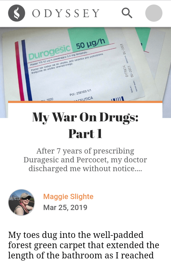 Then came “My War on Drugs,” an essay I’d been working on for months. In August of this year it will be a decade since I underwent the agonizing withdrawals from fentanyl and percocet, prescribed by my doctors for over seven years at that time. The story was divided into three parts per Odyssey’s format. Part One is here, then Part Two and finally the Conclusion. The stories are also hyperlinked within one another.